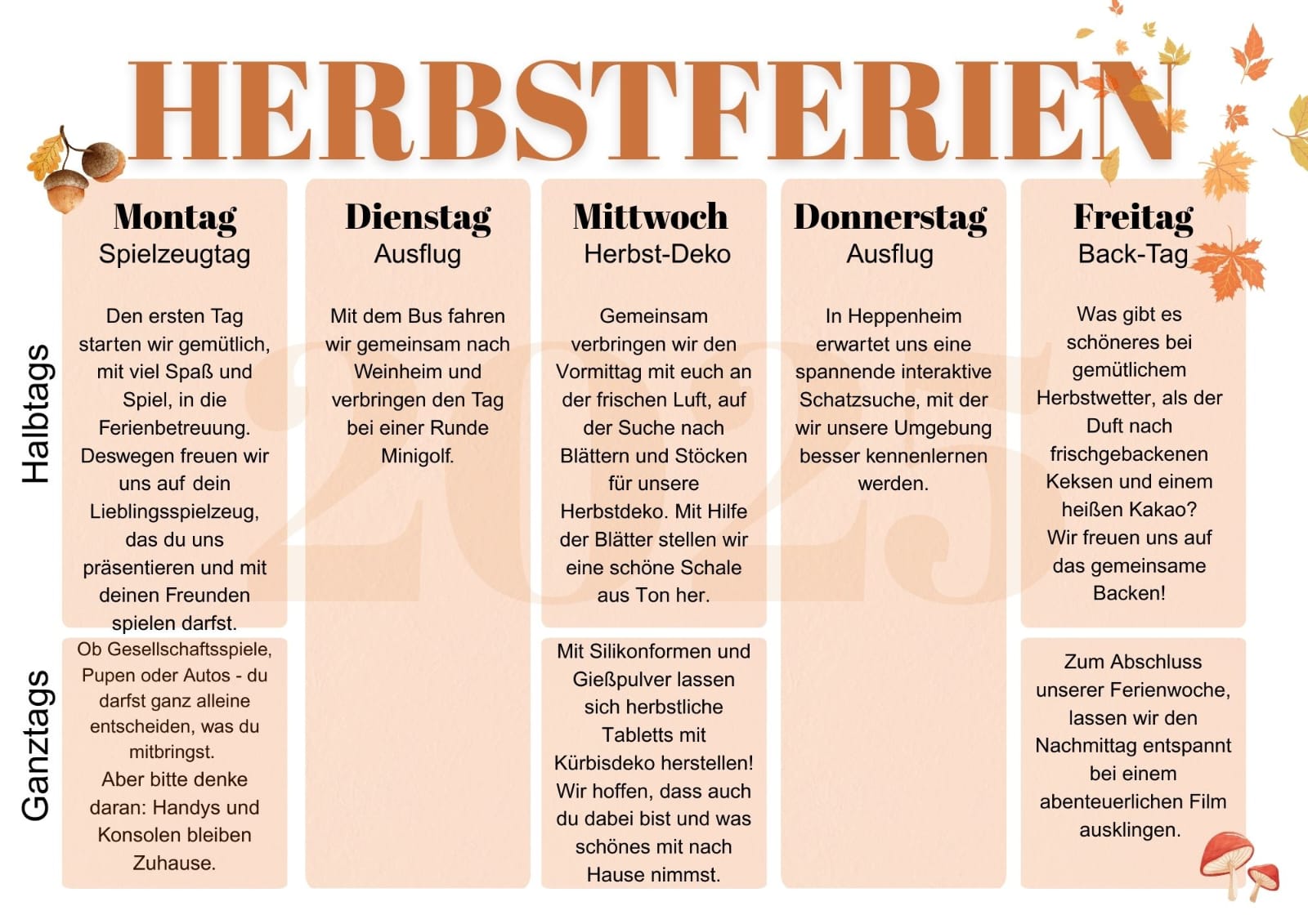 Das Programm der Betreuungswoche (zweite Woche der hessischen Herbstferien) steht in der folgenden Tabelle (Änderungen vorbehalten):