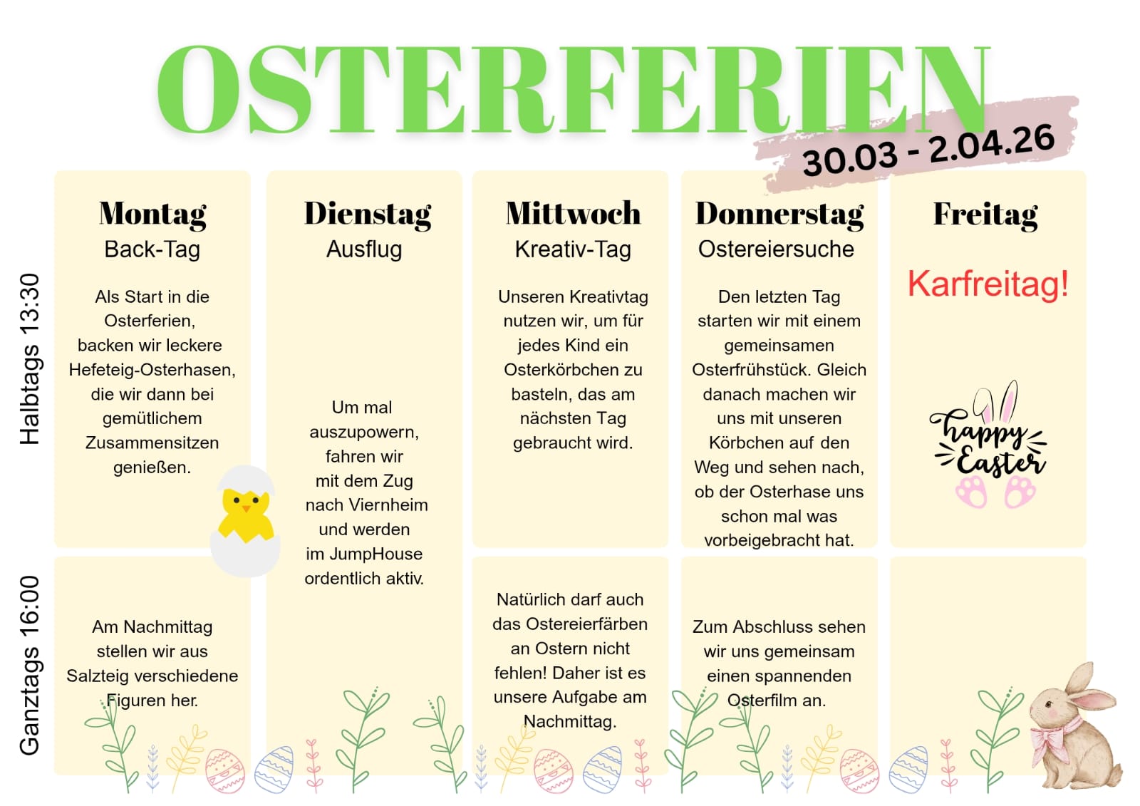 Das Programm der Betreuungswoche (erste Woche der hessischen Osterferien) steht in der folgenden Tabelle (Änderungen vorbehalten):